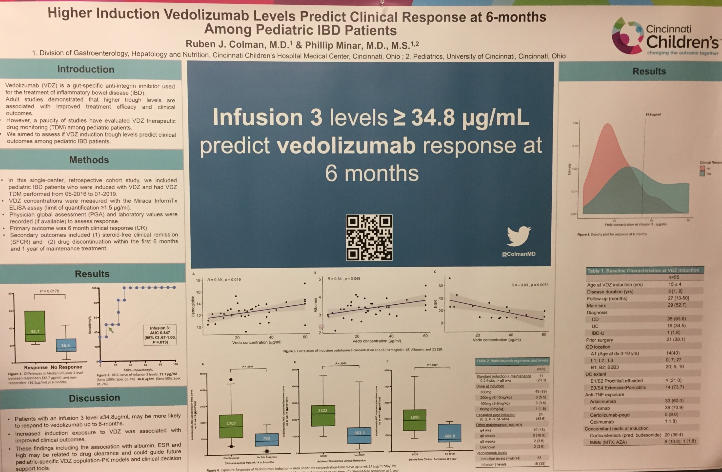 A study (poster below) from Cincinnati found that a vedolizumab level ≥34.8 mcg/mL at week 6 (prior to 3rd infusion) predicted clinical response at 6 months