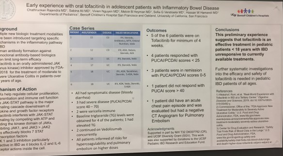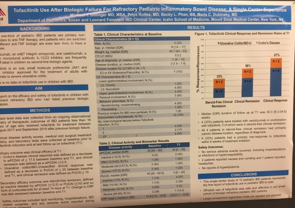 The next two studies provide some pediatric experience with tofacitinib in teenagers with inflammatory bowel disease (14-18 years of age). The first poster had 12 children and reported a 67% clinical response rate (cohort with 5 with CD, 5 with UC, and 2 with IC). The second poster had 4 of 6 with a clinical response and 3 in remission.