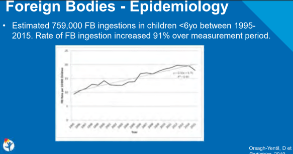 A recent retrospective study (D Orsagh-Yentis) Pediatrics 2019; 143: pii:320181988) examined children <6 years of age (n=759,054) and presentation to an emergency department in the U.S. for a foreign body ingestion (FBI) from 1995-2015. This study was reviewed at our recent national meeting by David Brumbaugh -related blog post: #NASPGHAN19 Postgraduate Course (Part 1) (Slides below).
