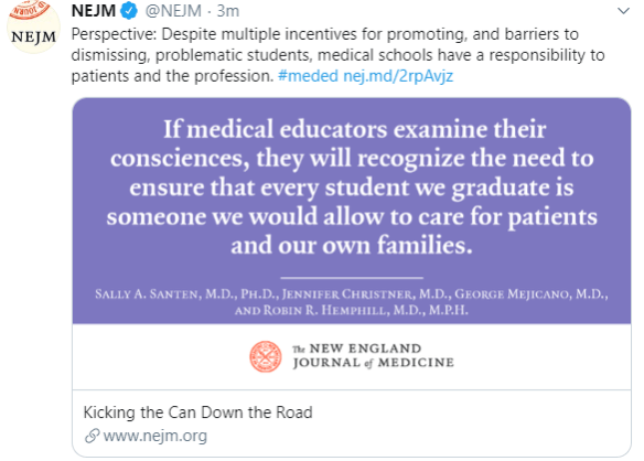 An interesting commentary (SA Santen et al. NEJM 2019; 381: 2287-9): “Kicking the Can Down the Road –When Medical Schools Fail to Self-Regulate”