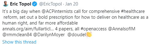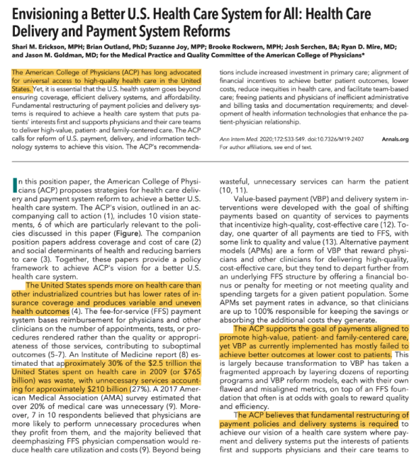 Several recent articles regarding reforming our current healthcare system have been published in Annals of Internal Medicine (Jan 2020) and are open access. Highlighted text in images below by Eric Topol, MD.