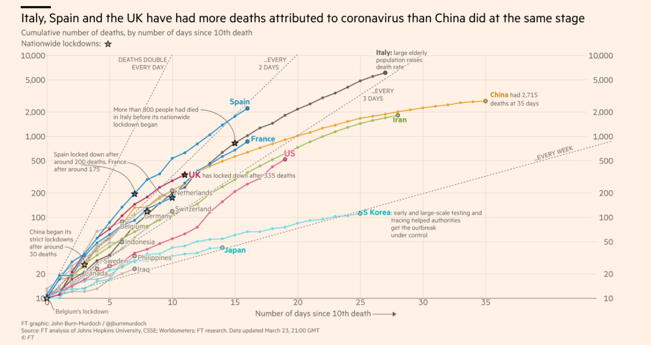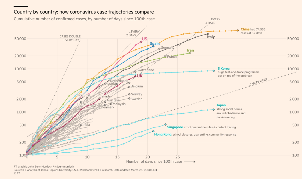 Here’s a link to Financial Times COVID-19 Tracker –includes logrithmic charts plotting the rates of reported infection and deaths and allows quick comparison between countries and high-volume locations (eg. Madrid, Lombardia, NY City). Some figures from March 23, 2100 GMT noted below; unfortunately, the U.S is likely to the world leader in number of reported cases quite soon.