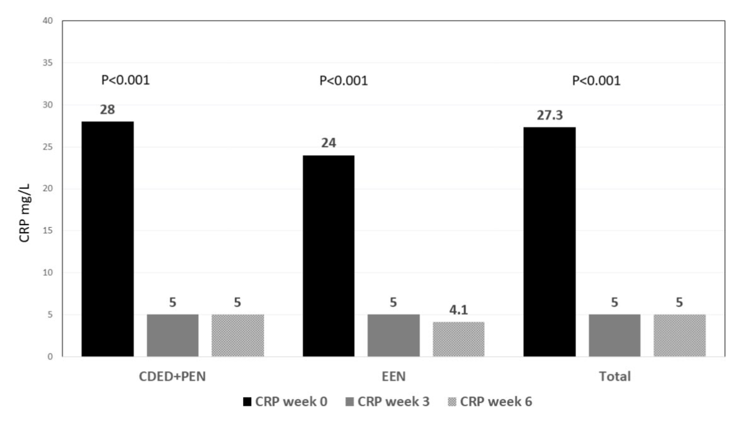 - Results: At week 3 of the diet, 82% of patients in the CDED group and 85% of patients in the EEN group had a dietary remission (DiRe). Median serum levels of C-reactive protein had decreased from 24 mg/L at baseline to 5.0 mg/L at week 3 (P<.001). Among the 49 patients in remission at week 6, 46 patients (94%) had a DiRe and 81% were in clinical remission by week 3. In multivariable analysis, remission at week 3 increased odds of remission by week 6 (odds ratio, 6.37; 95% CI, 1.6–25; P=.008) whereas poor compliance reduced odds of remission at week 6 (odds ratio, 0.75; 95% CI, 0.012–0.46; P=.006).