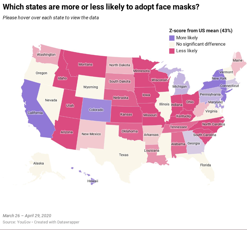 From YouGov survey: The states that are more and less likely to adopt face masks
