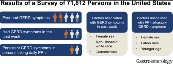 A recent study (SD Delshad, CV Almario et al. Gastroenterol 2020; 158: 1250-61) used survey data from an APP, MyGiHealth, to assess prevalence of reflux symptoms and symptoms that had not responded to proton pump inhibitor treatment.