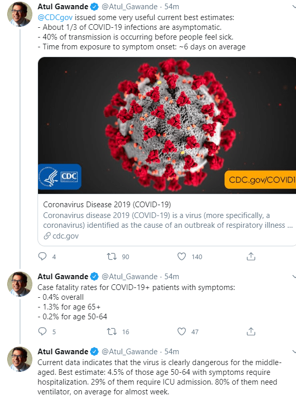 @Atul_Gawande: Latest Data from CDC Posted on May 22, 2020 by gutsandgrowth Link to CDC COVID-19 Website: Cases, Data and Surveillance Share this: Click to email a link to a friend (Opens in new window) Email Click to share on X (Opens in new window) X Click to share on Facebook (Opens in new window) Facebook Like Loading... Related