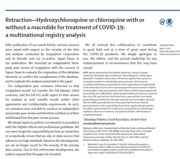 - Lancet: Retraction—Hydroxychloroquine or chloroquine with or without a macrolide for treatment of COVID-19: a multinational registry analysis Original study: Hydroxychloroquine or chloroquine with or without a macrolide for treatment of COVID-19: a multinational registry analysis