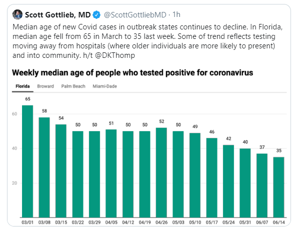 The fact that younger adults account for a large fraction of the new cases is likely a significant reason why the number of daily deaths has not spiked (& improved).