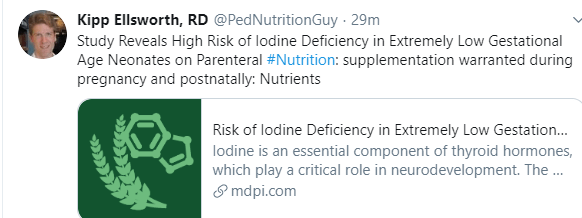 Background/Methods: Extremely Low Gestational Age Newborns (ELGAN) do not receive Iodine supplementation while on parenteral nutrition (PN)….We measured urine iodine levels and thyroid function tests in 50 mother–infant dyads at birth, at 1 week, 1, 2, 3 months and near discharge. In our study, 64% of mothers were iodine deficient at the time of delivery.