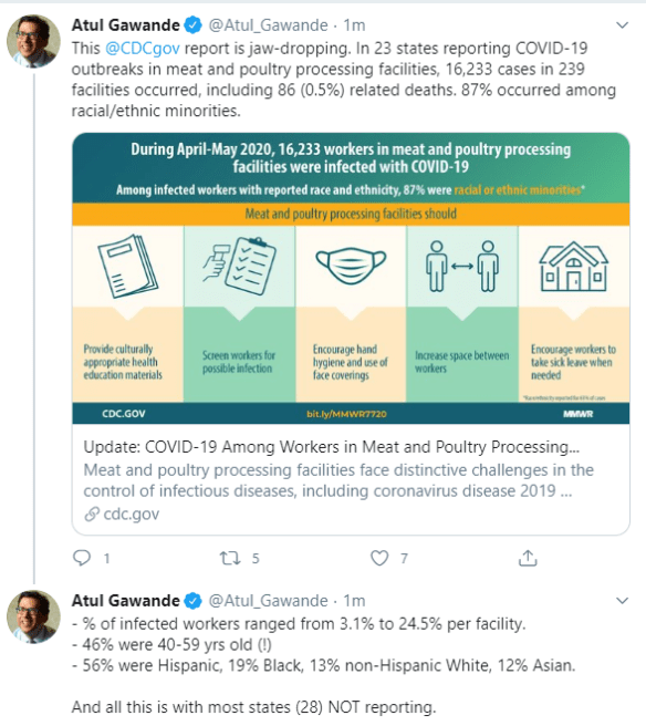 It is widely recognized that the meat processing industry has been hit hard; here’s the data: more than 16,000 cases in April-May from 23 reporting states: