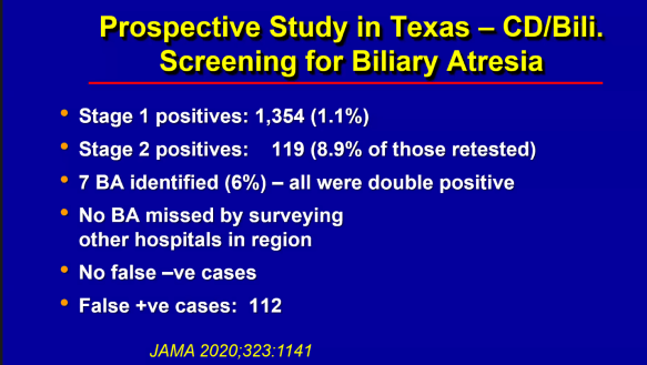 - Uniform screening of fractionated bilirubin has been effective in Texas: Diagnostic Yield of Newborn Screening for Biliary Atresia Using Direct or Conjugated Bilirubin Measurements S Harpavat et al. JAMA 2020; 323: 1141-50