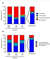 “Bar chart for histological (A) and symptomatic (B) responses for proton pump inhibitor (PPI) mono‐therapy to induce and maintain remission in patients with eosinophilic oesophagitis. For induction of remission, patients were classified according to the PPI dosage prescribed: high dose was double dosage or higher, and low dose was standard dosage or lower. For maintenance therapy, only patients with dosage reduction from that used for induction were included. eos/hpf: eosinophils per high power field”