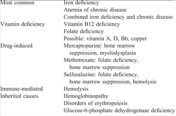 • “IDA is the most common cause of anemia in children with IBD. True iron deficiency results from a number of factors, including chronic blood loss secondary to gastrointestinal bleeding, decreased iron absorption because of tissue or systemic inflammation and from reduced absorptive surface area. “
