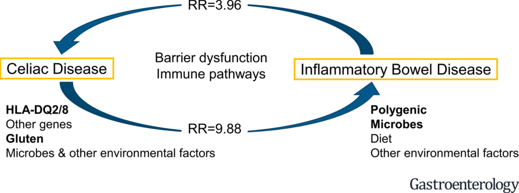 - Among patients with celiac disease, there was an increased risk of IBD vs controls (RR 9.88; 95% CI 4.03–24.21); the risk was greater for Crohn’s disease than ulcerative colitis