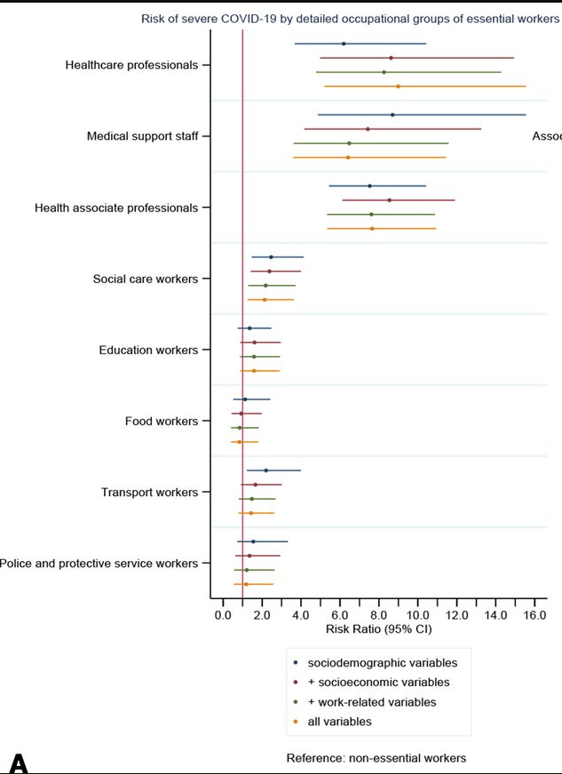 My take: This study shows the increased risk of severe COVID-19 among essential workers, particularly in healthcare field and non-white ethnicity was associated with further increased risk.