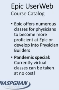 - Epic has free classes (User Web -see slide below) available to help practitioners become more proficient (eg. Power User Course)