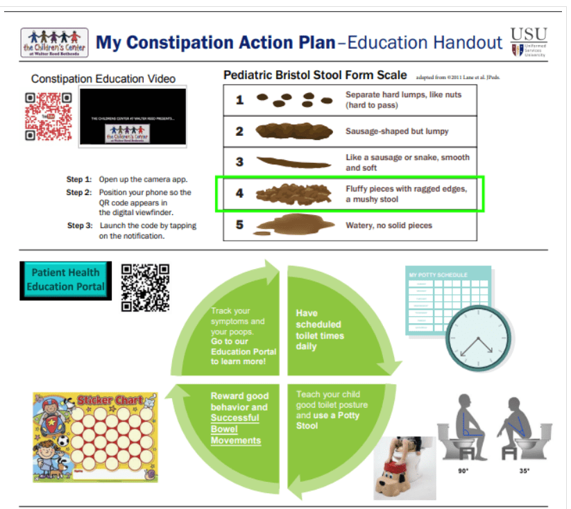 A recent study (PT Reeves et al. J Pediatr 2021; 229: 118-126. Full text link: Development and Assessment of a Pictographic Pediatric Constipation Action Plan) highlighted patient education efforts. “This study focused on the design and assessment of a low literacy pictographic CAP for the care of functional constipation in children.”