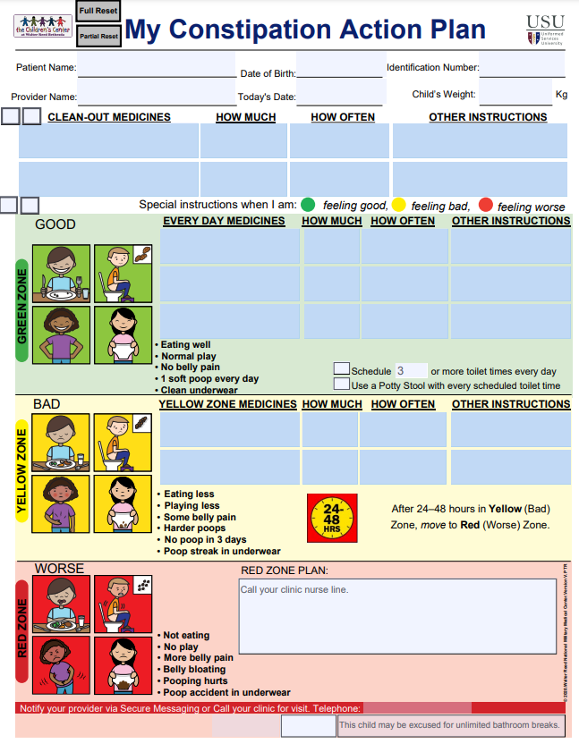 A recent study (PT Reeves et al. J Pediatr 2021; 229: 118-126. Full text link: Development and Assessment of a Pictographic Pediatric Constipation Action Plan) highlighted patient education efforts. “This study focused on the design and assessment of a low literacy pictographic CAP for the care of functional constipation in children.”