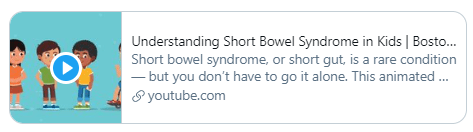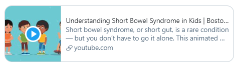 - Boston Children’s: YouTube: Understanding Short Bowel Syndrome in Kids (1:42 min)