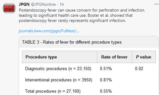 My take: The authors note that fever is often related to release of inflammatory cytokines which can occur with endoscopy in the absence of complications. The authors methodical guideline to post-procedure fever provides a logical approach to this common problem.