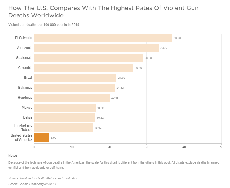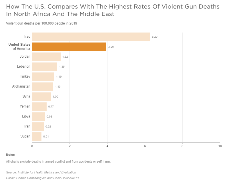 As it turns out, gun violence deaths are higher in the U.S. than in Afghanistan, according to a recent NPR article: Gun Violence Deaths: How The U.S. Compares With The Rest Of The World. In addition, there are more gun deaths in children 4 and younger than police (NY Times: How Do We Stop the Parade of Gun Deaths? April 3, 2021).
