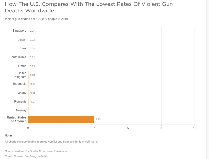 As it turns out, gun violence deaths are higher in the U.S. than in Afghanistan, according to a recent NPR article: Gun Violence Deaths: How The U.S. Compares With The Rest Of The World. In addition, there are more gun deaths in children 4 and younger than police (NY Times: How Do We Stop the Parade of Gun Deaths? April 3, 2021).
