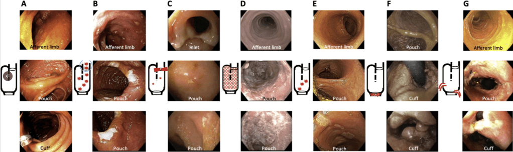 The authors retrospectively reviewed 1359 pouchoscopies and classified them into 7 main pouch phenotypes: (1) normal, (2) afferent limb involvement, (3) inlet involvement, (4) diffuse, (5) focal inflammation of the pouch body, (6) cuffitis, and (7) pouch with fistulas noted 6 months after ileostomy takedown.