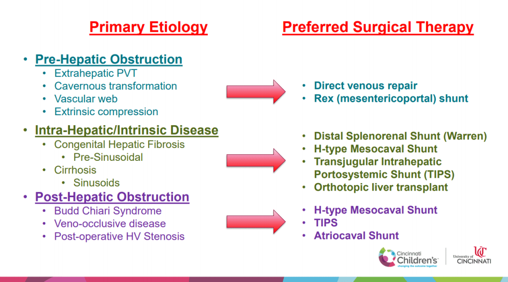 - Surgical options are based on primary etiology: pre-hepatic, intra-hepatic, and post-hepatic