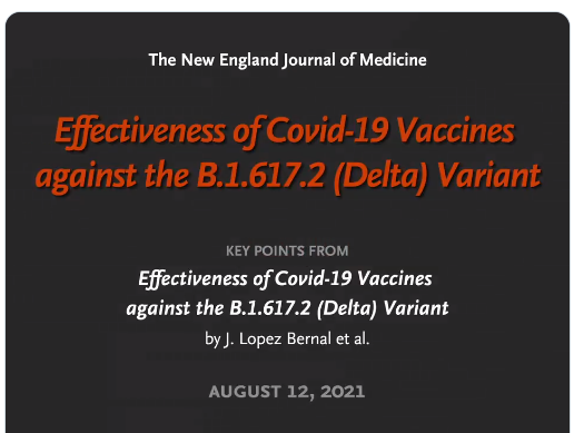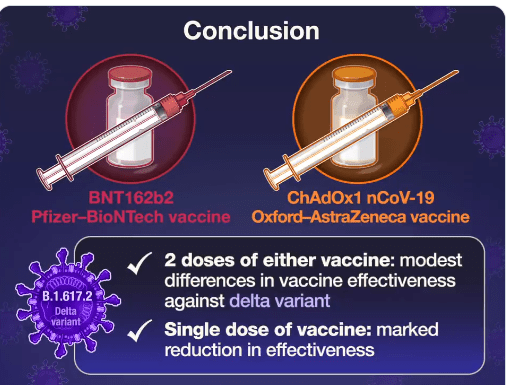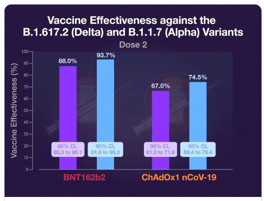 Also, NEJM Quick take: Effectiveness of COVID-19 Vaccines (1:29 min). Pfizer-(BNT162b2) vaccine had 88% effectiveness against Delta variant in England after 2 doses compared to 94% for alpha variant..