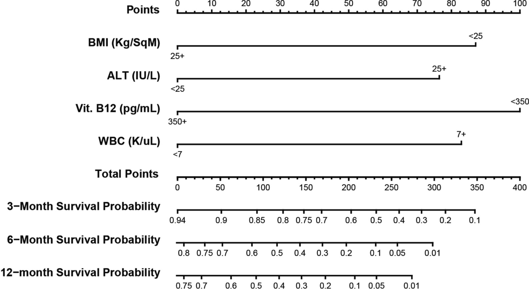 - There were 4 factors associated with complicated course in treatment-naïve patients: body mass index <25 kg/m2 (hazard ratio [HR], 2.45; 95% CI, 1.07–5.43; P = .033), serum level of vitamin B12 <350 pg/mL (HR, 2.78; 95% CI, 1.21–6.41; P = .016), white blood cells ≥7 × 103/μL (HR, 2.419; 95% CI, 1.026–5.703; P = .044), and serum level of ALT ≥25 IU/L (HR, 2.680; 95% CI, 1.186–6.058; P = .018).