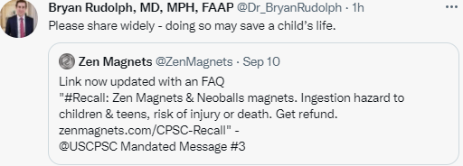 Link now updated with an FAQ “#Recall: Zen Magnets & Neoballs magnets. Ingestion hazard to children & teens, risk of injury or death. Get refund. https://zenmagnets.com/CPSC-Recall” – @USCPSC Mandated Message #3