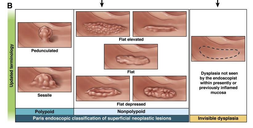 Best Practice Advice 1: Precancerous colorectal lesions in inflammatory bowel disease should be described as either polypoid (≥2.5 mm tall), nonpolypoid (<2.5 mm), or invisible (detected on nontargeted biopsy), using a modified Paris Classification. The older terms dysplasia-associated lesion or mass, adenoma-like mass, and flat dysplasia (when referring to dysplasia detected in nontargeted biopsies) should be abandoned.