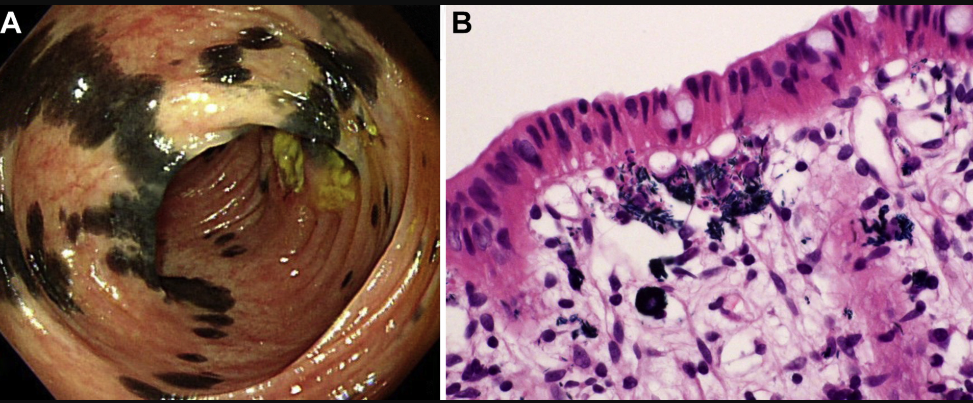 The image below is from a 57 yo woman with Crohn’s disease who was taking a supplement, indigo naturalis (Qing-Dai). “Higher magnification disclosed bluish, needle-like crystals in the cytoplasm of these histiocytes. In light of the presence of pigment-laden histiocytes, we called the lesions indigo naturalis-related pseudomelanosis. Unlike melanosis coli, which typically shows continuous homogeneous brown or black discoloration of colon mucosa (snake-skin appearance or starry sky appearance), indigo naturalis-related pseudomelanosis exhibits a haphazard distribution of black discoloration reminiscent of the skin markings of Holstein Friesian cattle…It remains to be seen whether deposition of indigo naturalis has any long-term adverse effect, although histologically the mucosa with indigo deposition was not accompanied by significant inflammatory activity.”