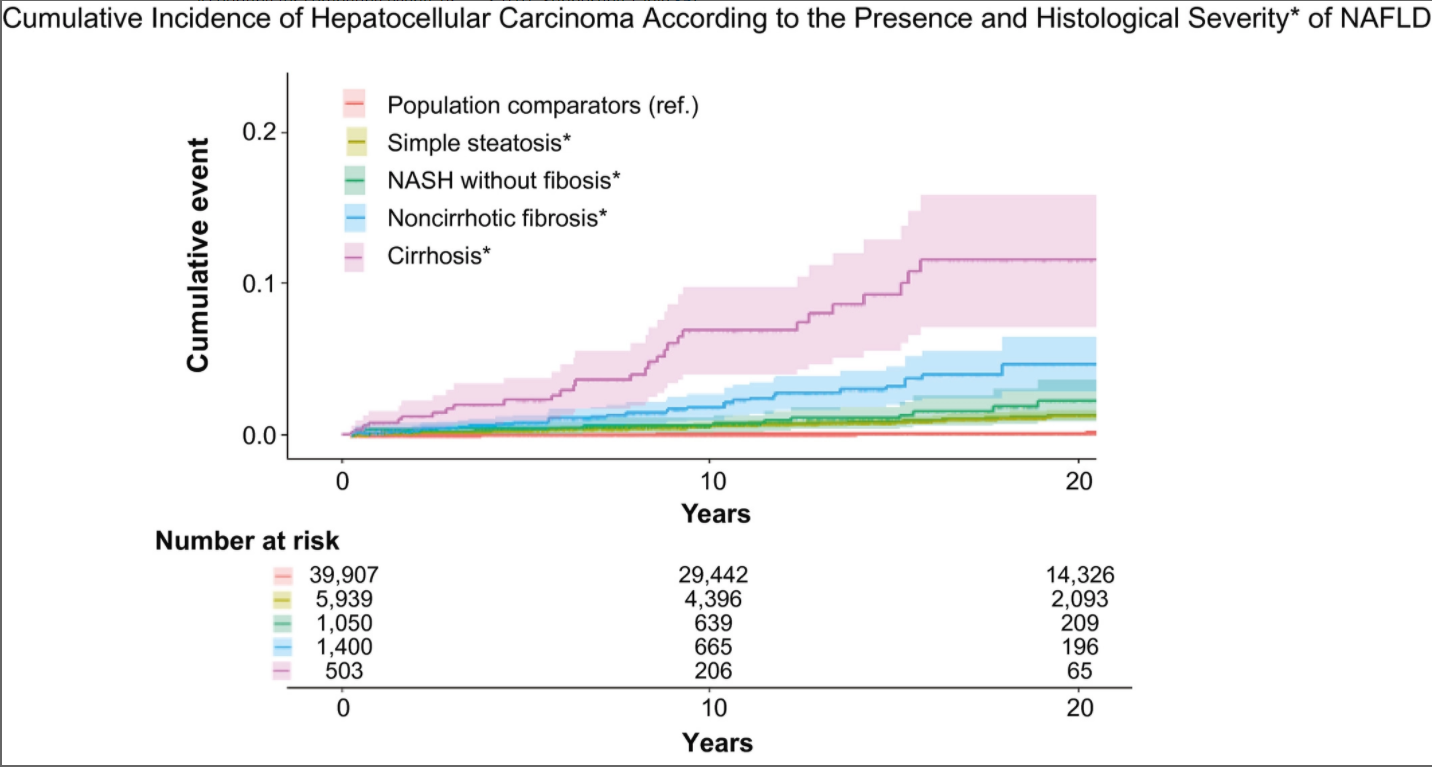 - “Compared with controls, patients with NAFLD had a17-fold higher rate of developing HCC and a 20-year absolute excess risk of 2.1%.”
