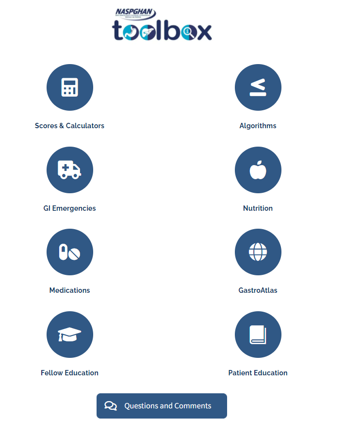 The App is equipped with ready access to: clinical calculators, guidelines and algorithms, medication guides, patient education resources, and more. You can access the Toolbox via its URL (https://toolbox.naspghan.org/) on your phone or computer.