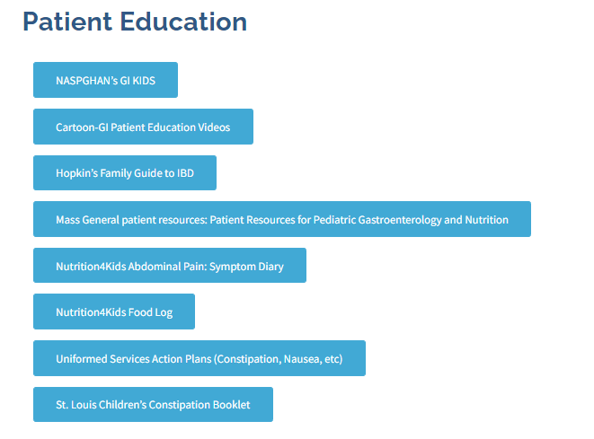- Nutrition tab has links to ASPEN formulas, dietary recommendations for numerous conditions (IBD, EoE, Liver disease, Obesity), feeding tubes/feeding tube awareness website