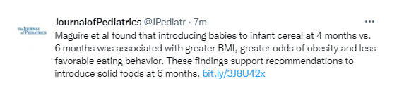 My take: This study indicates that introduction of cereal at 6 months of age, rather than 4 months of age, may be beneficial in limiting excess weight gain.