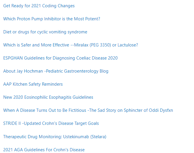 Most Popular Posts of 2021 Posted on December 30, 2021 by gutsandgrowth Links to Top 6: Get Ready for 2021 Coding ChangesWhich Proton Pump Inhibitor is the Most Potent?Diet or drugs for CVSWhich is Safer and More Effective –Miralax (PEG 3350) or Lactulose?ESPGHAN Guidelines for Diagnosing Coeliac (Celiac) Disease 2020About Jay Hochman -Pediatric Gastroenterology Blog Share this: Click to email a link to a friend (Opens in new window) Email Click to share on X (Opens in new window) X Click to share on Facebook (Opens in new window) Facebook Like Loading... Related