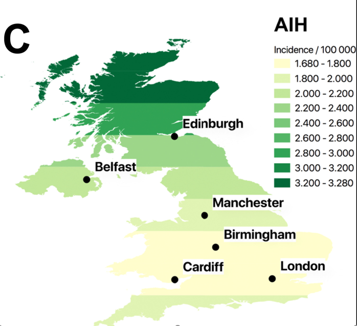 My take: In the UK, there is an association between a more northernly latitude and both PBC and AIH.