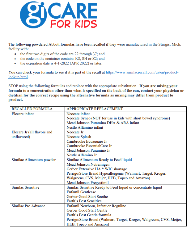 Yesterday, this blog noted the recall of several formulas (FDA Warns Consumers Not to Use Certain Powdered Infant Formula Produced in Abbott Nutrition’s Facility in Sturgis, Michigan). Our office has made a substitution table for the Abbott formulas: