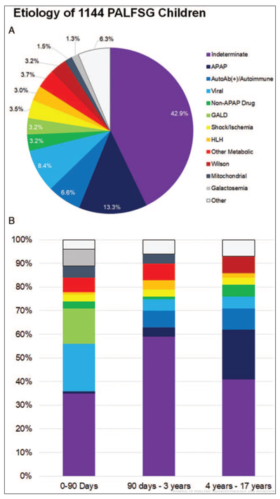 (A) Etiology for 1144 children from the Pediatric Acute Liver Failure Study Group (PALFSG) 1999–2014. (B) Final diagnosis by age (note: figure B includes information on only 985 participants)