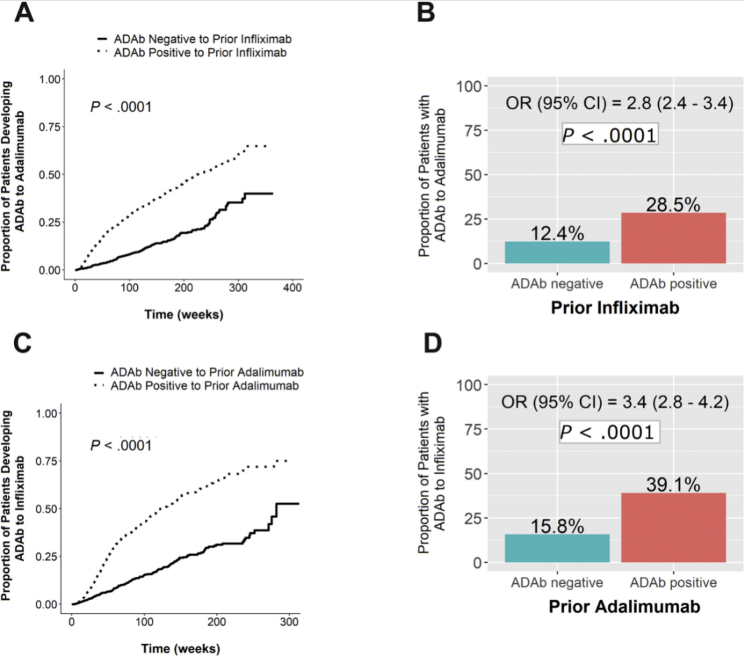 - As noted in figure below, prior antidrug antibodies ADAb) to anti-TNF agent was associated with development of ADAb with 2nd anti-TNF agent. This risk was >2-fold higher when switching from IFX to ADM (B in Figure) and even more when switching from ADM to IFX (D in Figure)