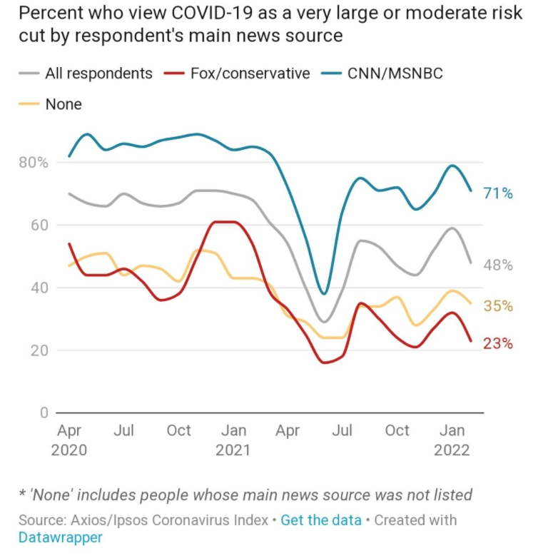 Perception of COVID-19 Risk, Vaccine Uptake and Media Source Posted on March 21, 2022 by gutsandgrowth These charts were posted on Nate Silver’s twitter feed. Share this: Click to email a link to a friend (Opens in new window) Email Click to share on X (Opens in new window) X Click to share on Facebook (Opens in new window) Facebook Like Loading... Related