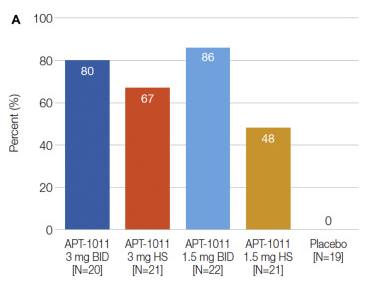 - Histologic response (≤6 eosinophils per high-power field at Week 12) rates were 0% for placebo, 80% for APT-1011 3 mg twice daily (BID), 67% for 3 mg at bedtime (HS), 86% for 1.5 mg BID, 48% for 1.5 mg HS (P < .001 for all groups vs placebo).