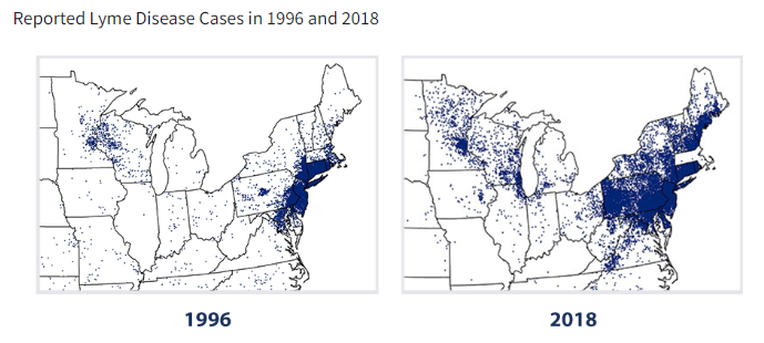 “Between 2004 and 2018, the number of reported illnesses from mosquito, tick, and flea bites more than doubled, with more than 760,000 cases reported in the United States. Nine new germs spread by mosquitoes and ticks were discovered or introduced into the United States during this period. The geographic ranges where ticks spread Lyme disease, anaplasmosis, ehrlichiosis, and spotted fever rickettsiosis have expanded, and experts predict that tickborne diseases will continue to increase.”