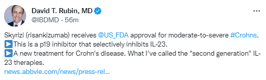 Abbvie Press Release: SKYRIZI® (risankizumab-rzaa) Receives FDA Approval as the First and Only Specific Interleukin-23 (IL-23) to Treat Moderately to Severely Active Crohn’s Disease in Adults