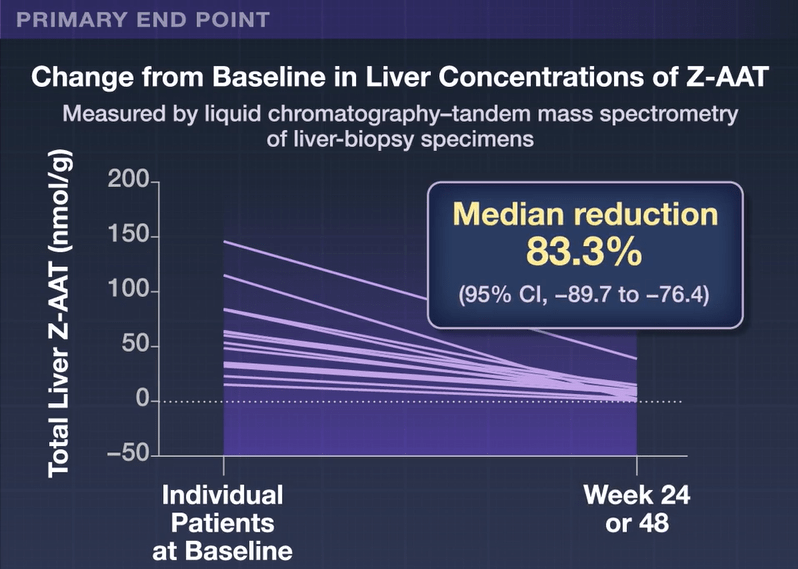 - All the patients had reduced accumulation of Z-AAT in the liver (median reduction, 83% at week 24 or 48)