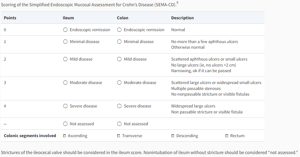 “The SEMA-CD is scored by assigning a numerical value ranging from 0 (endoscopic remission) to 4 (severe disease) for each bowel region (ileum and colon). The overall colon is scored as a whole based on the most severe colonic segment. The number of colonic segments with any degree of active disease is recorded, regardless of the severity of individual segments. The overall colon score is then multiplied by the number of involved colonic segments, and the result is added to the ileum score.”
