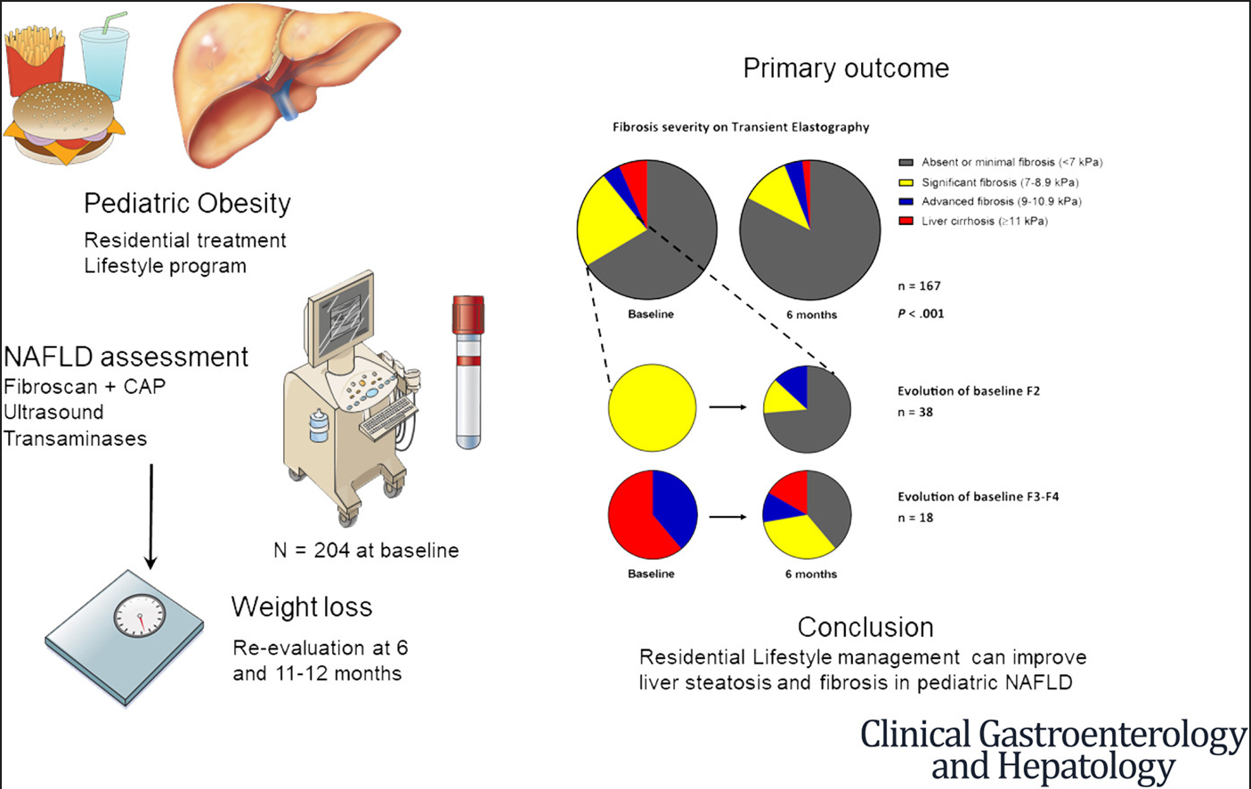 In this prospective study, pediatric patients with NAFLD received intensive lifestyle therapy which encompassed caloric restriction, physical activity, education on a healthy lifestyle, and psychosocial support. Key findings: