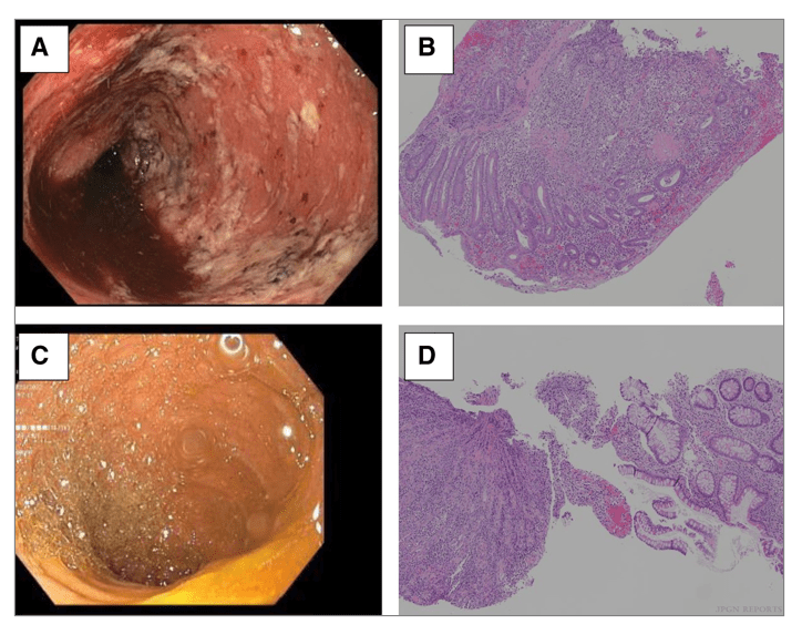 (A) Initial ileoscopy image—diffuse inflammation characterized by erythema, exudate, and friability. (B) Initial ileal histopathology—severe active ileitis, erosion, and focal crypt irregularity (magnification 100×).